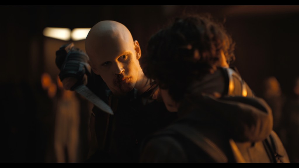 Speaking of Feyd, the youngest brother of Rabban and nephew of the Baron is a sadistic psychopath. On paper he’s nothing more than a physical adversary for Paul but the film does an excellent job of showing the threat he poses with a blade. It’s hard not to flinch whenever he moves.