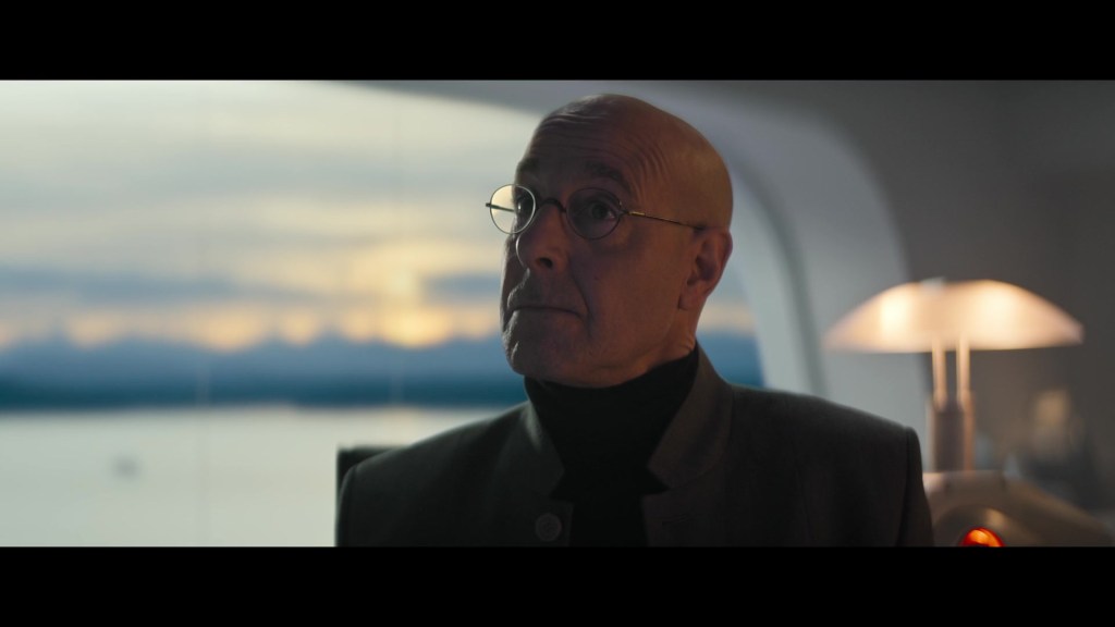 Stanley Tucci plays the only interesting character. He’s the CEO of a company that designed the technology that defeated the robots in the war. He has an optimistic view of technology and its potential, specifically for recreating memories in virtual reality. He’s the big bad of the film who hires Esposito’s cop as well as deploy troops to stop Michelle. He’s the only character who has any blatant dimension hence when he’s not being the villain of the piece, he can be fun to watch.